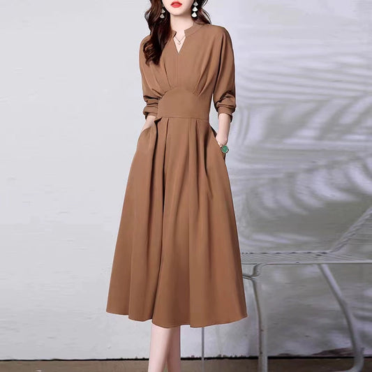 長袖 Vネック フリルカラー ワンピース ミディ丈 ワンピ 通勤 00265