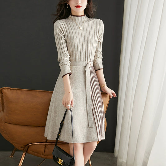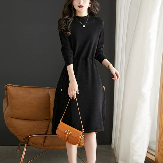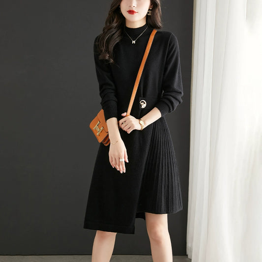 ニットワンピース サイドプリーツ 長袖 ハーフハイネック ひざ丈 Aライン ウール ワンピ 通勤 00273