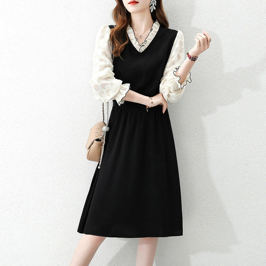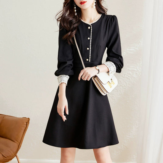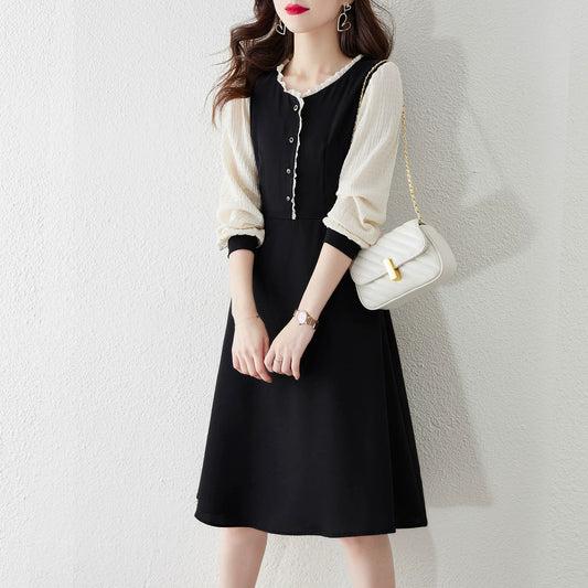 長袖 ワンピース レース襟 ラウンドネック レースカフス ワンピ 通勤 00266