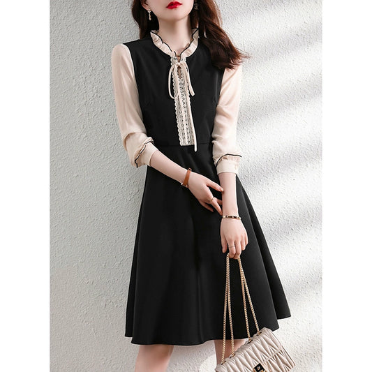 長袖 ワンピース フリル襟 リボンタイ ひざ丈 バイカラー 切り替え ワンピ 通勤 00270