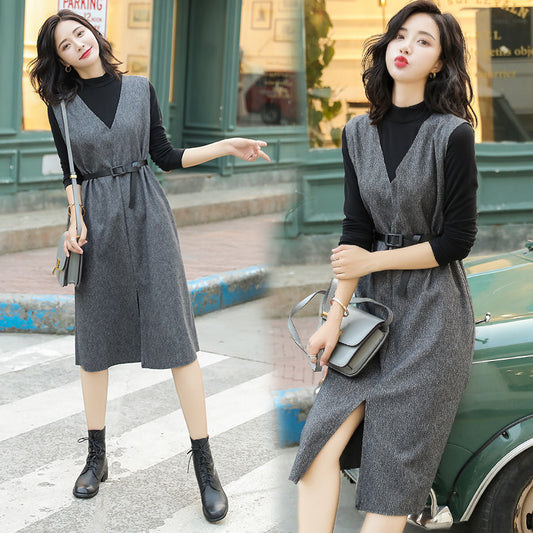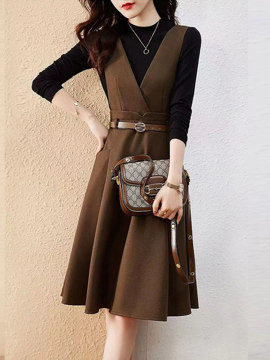 ニットワンピース フェイクレイヤード 長袖 Vネック ひざ丈 Aライン ウール ワンピ 通勤 00271