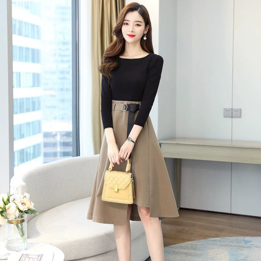 ドッキングワンピース アシンメトリー 長袖 ひざ丈 Aライン 切り替え ワンピース ワンピ 通勤 00275