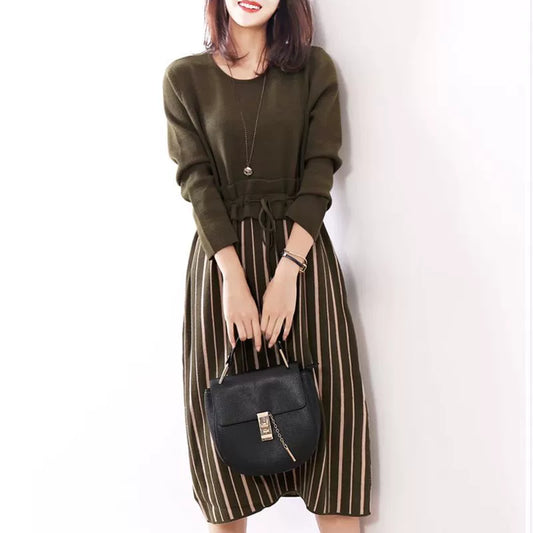 ニットワンピース 長袖 ラウンドネック ひざ丈 ストライプ ドッキングワンピース 通勤 ワンピ 00282