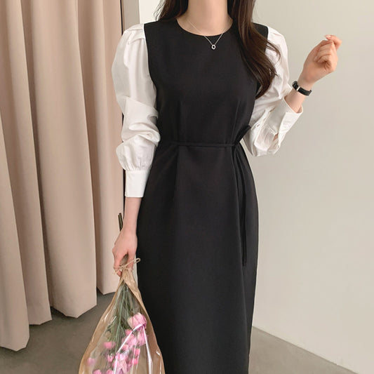 パフスリーブ ロングワンピース ウエストマーク 切り替え ドッキングワンピース ワンピ 通勤 00280
